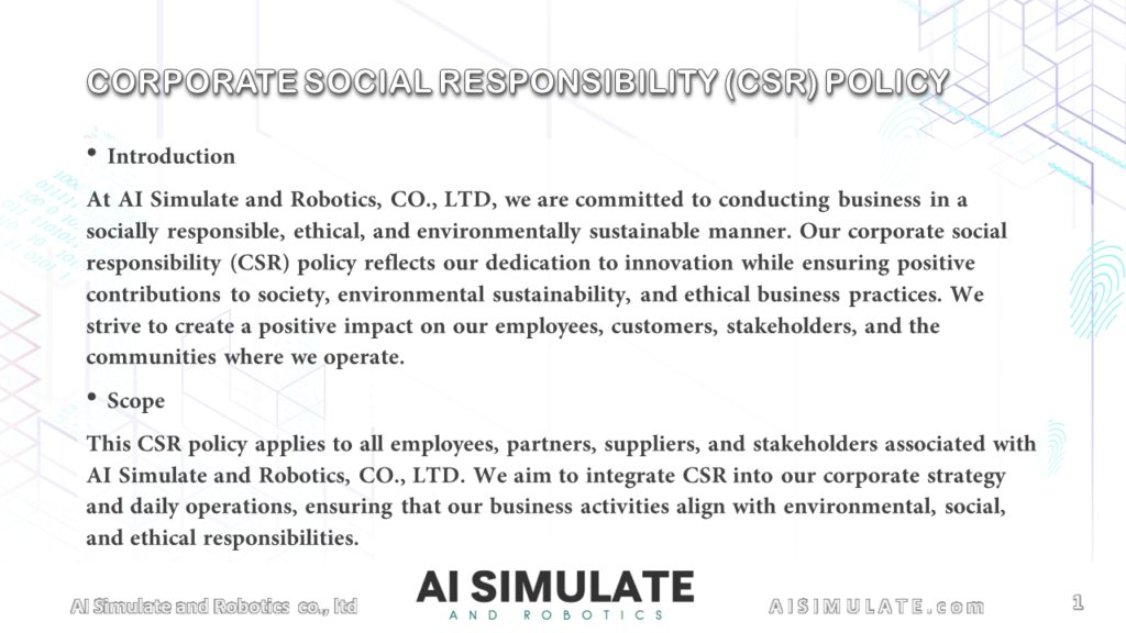 This CSR policy applies to all employees, partners, suppliers, and stakeholders associated with AI Simulate and Robotics, CO., LTD. We aim to integrate CSR into our corporate strategy and daily operations, ensuring that our business activities align with environmental, social, and ethical responsibilities.