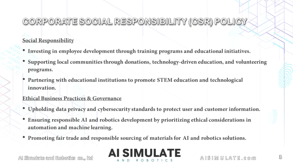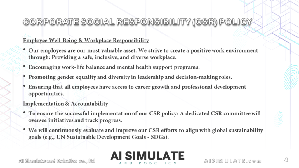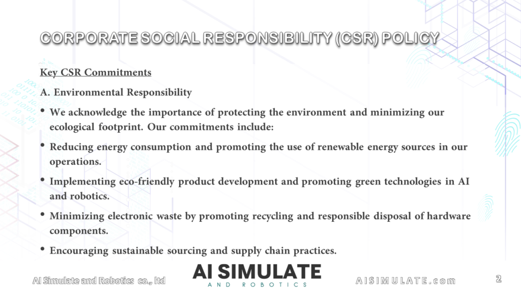 At AI Simulate and Robotics, CO., LTD, we are committed to conducting business in a socially responsible, ethical, and environmentally sustainable manner. Our corporate social responsibility (CSR) policy reflects our dedication to innovation while ensuring positive contributions to society, environmental sustainability, and ethical business practices. We strive to create a positive impact on our employees, customers, stakeholders, and the communities where we operate.