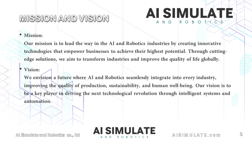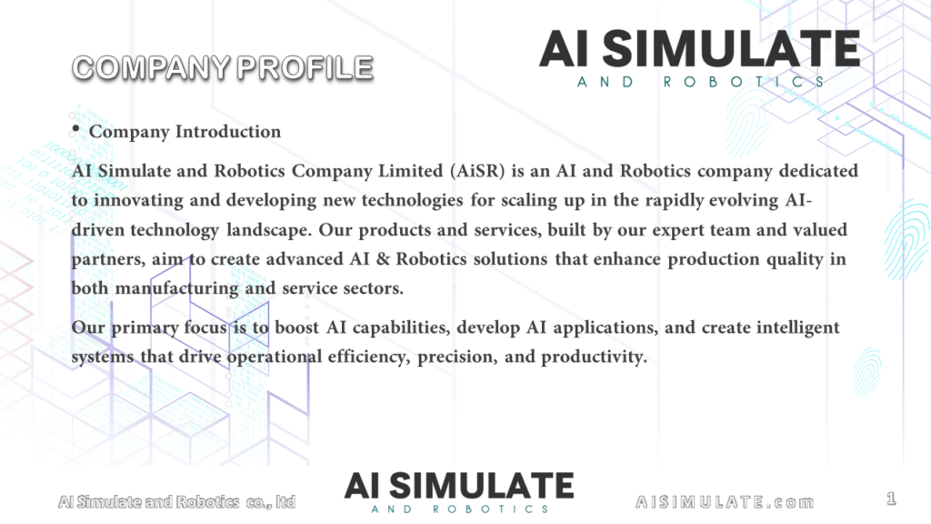 AI Simulate and Robotics Company Limited (AiSR) is an AI and Robotics company dedicated to innovating and developing new technologies for scaling up in the rapidly evolving AI-driven technology landscape. Our products and services, built by our expert team and valued partners, aim to create advanced AI & Robotics solutions that enhance production quality in both manufacturing and service sectors. Our primary focus is to boost AI capabilities, develop AI applications, and create intelligent systems that drive operational efficiency, precision, and productivity.